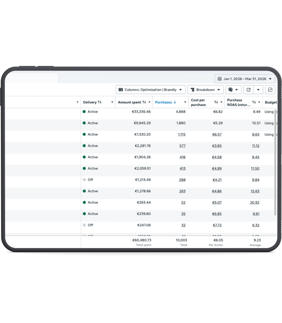 Vođenje i optimizacija isključivo prodajnih kampanja. Ne radimo boost ili message kampanje – već samo prodajne kampanje koje donose najbolji ROAS.